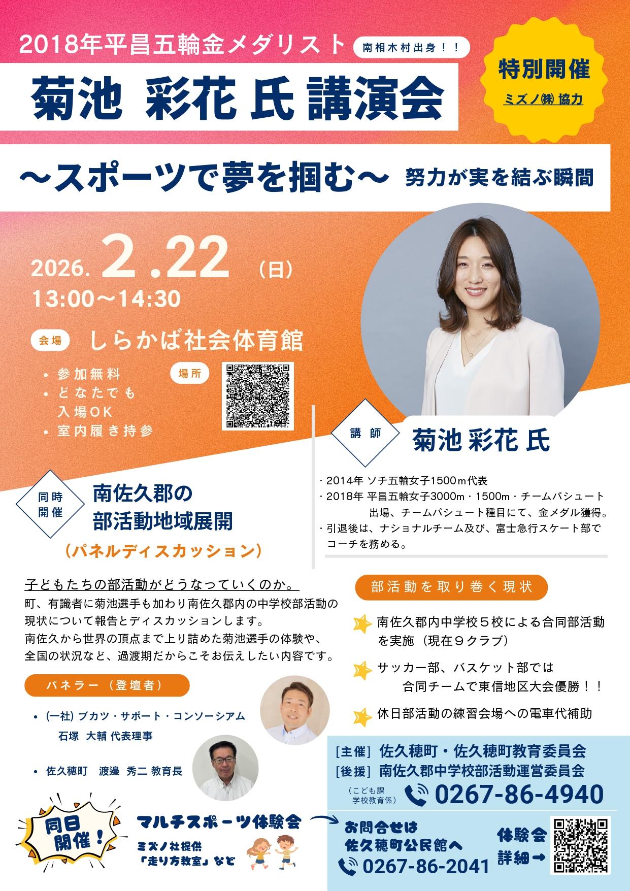 また、体験会内では、2018年平昌五輪金メダリストで南相木村出身の菊池彩花氏による講演会及びパネルディスカッションも特別開催いたします。
